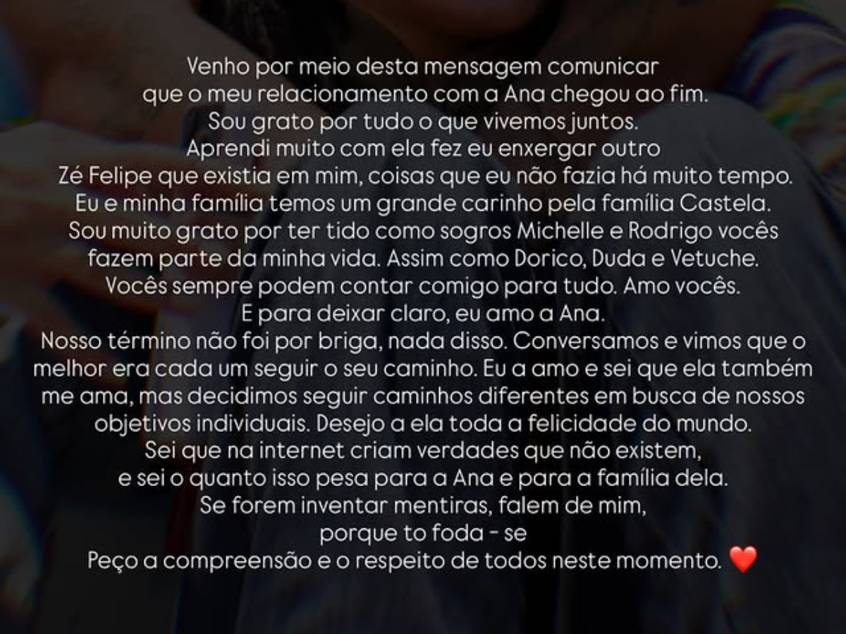Ana Castela e Zé Felipe anunciaram o fim do namoro na noite desta segunda-feira (29), após cerca de dois meses de relacionamento. O término foi comunicado pelo cantor e compartilhado pela sertaneja na...