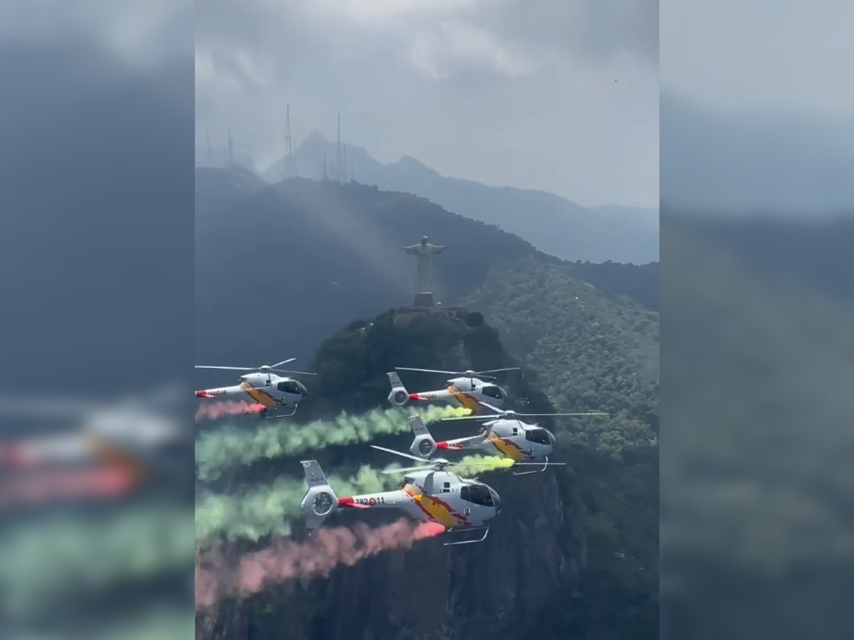 E não parou por aí. As aeronaves também passaram pelo Cristo Redentor, soltando fumaça colorida nas cores da bandeira da Espanha, transformando o cartão-postal em cenário de show aéreo. Tudo isso foi apenas um ensaio para a apresentação oficial que acontece nesta quarta-feira, às 10h15, novamente na praia de Ipanema.