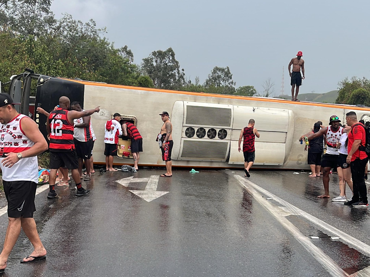 Um vídeo de câmera de segurança registrou o momento em que um ônibus com torcedores do Urubuzada, uma organizada do Flamengo, tombou na Rodovia Presidente Dutra, nesta segunda-feira (27).